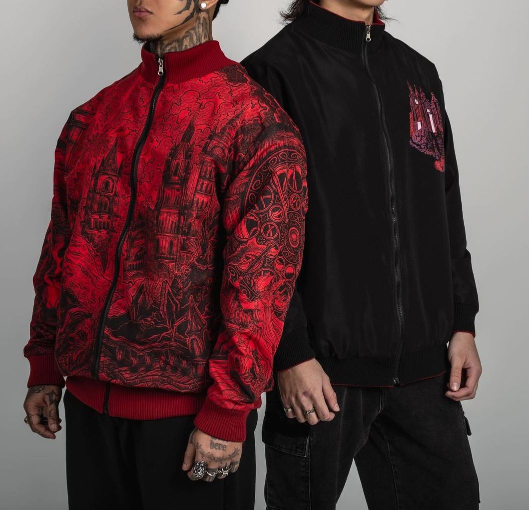 Double-sided bomber jacket, colored art on the black side and full-print art on the crimson side, screen-printed.