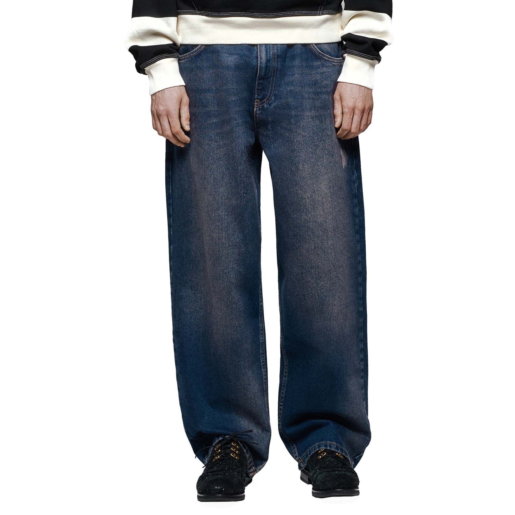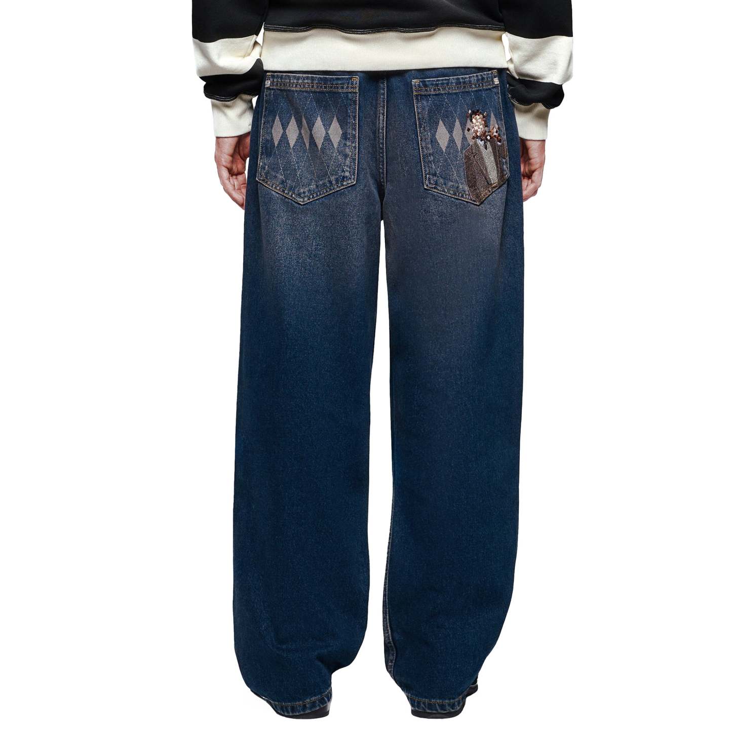 14,5oz denim / 100% cotton / laser printed plaid pattern details on front and back pockets / embroidery on back / deboss printed leather patch / effect washing / fits true to size
