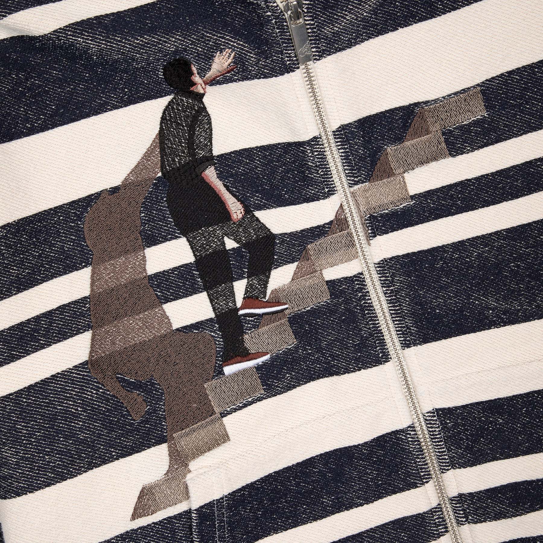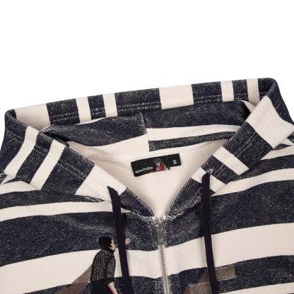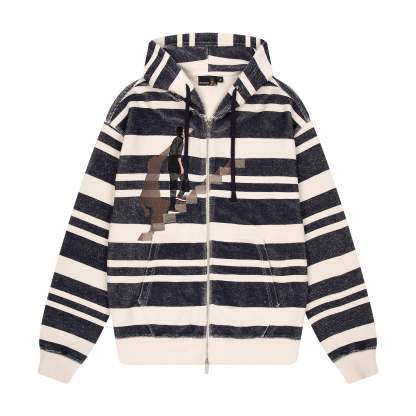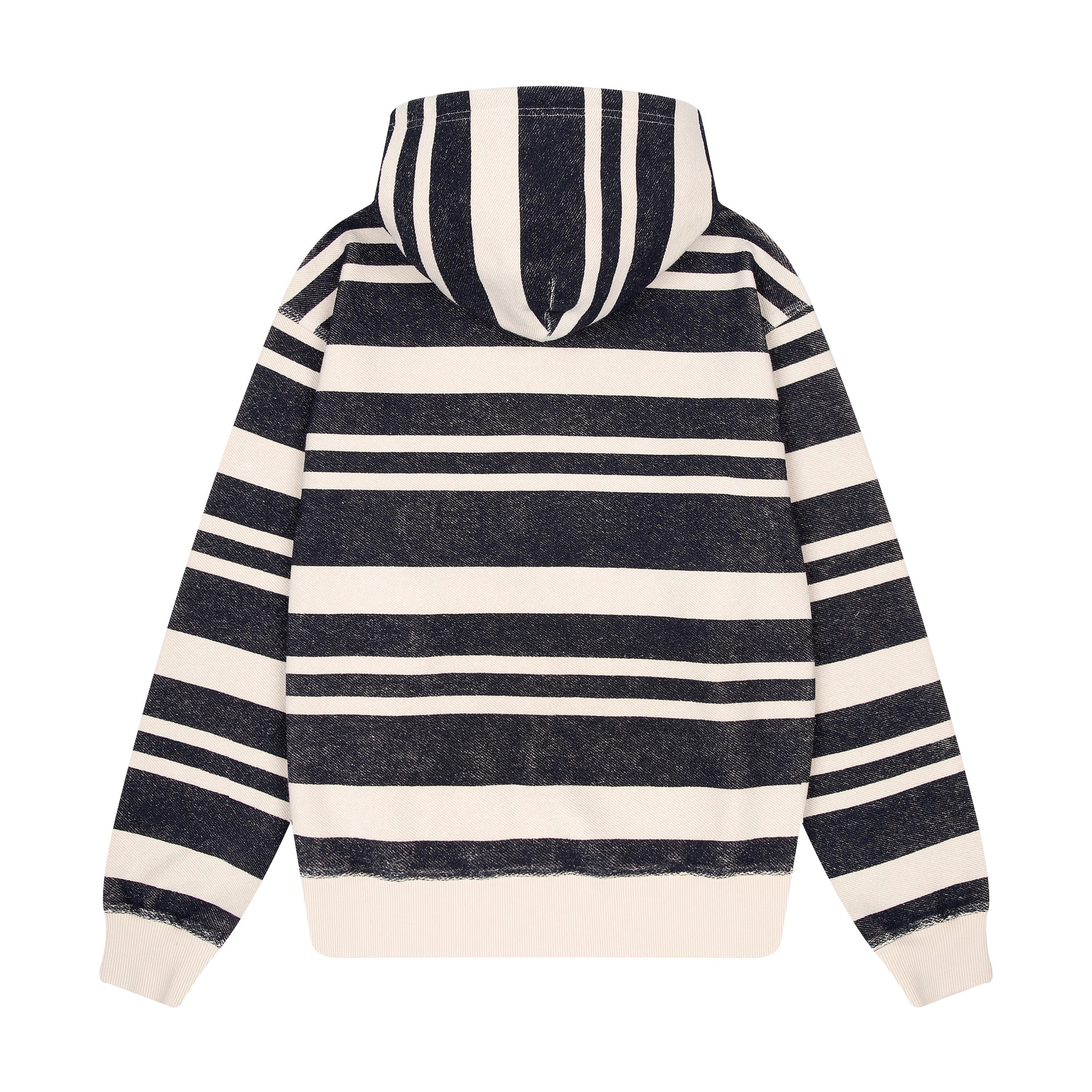 460gsm / 100% preshrunk cotton / reversed side of fabric used intentionally / printed stripes (wash and iron inside out at low heat) / embroidery on front / with double-slided YKK zipper / fits true to size