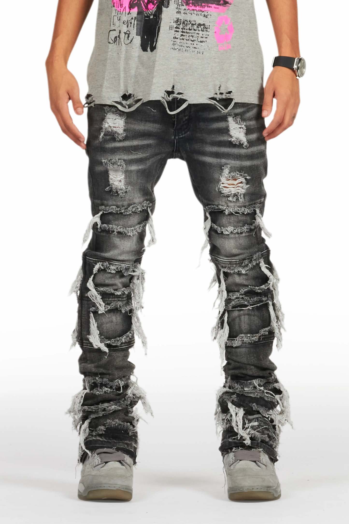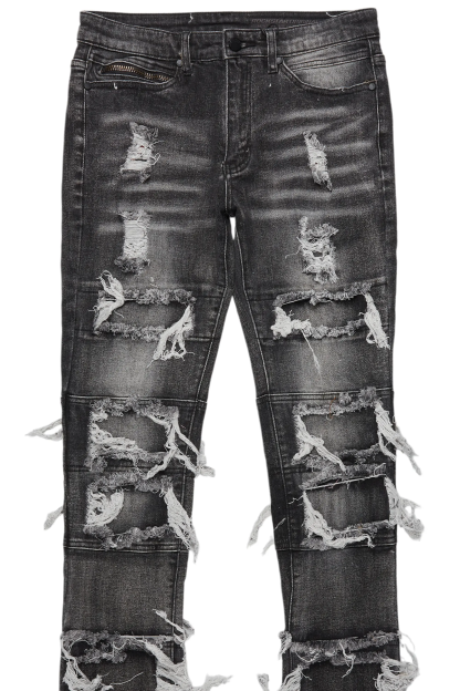 An urban stacked denim jean for men in grey. Designed with organic cotton and extra long legs for a must-cop streetwear staple piece.