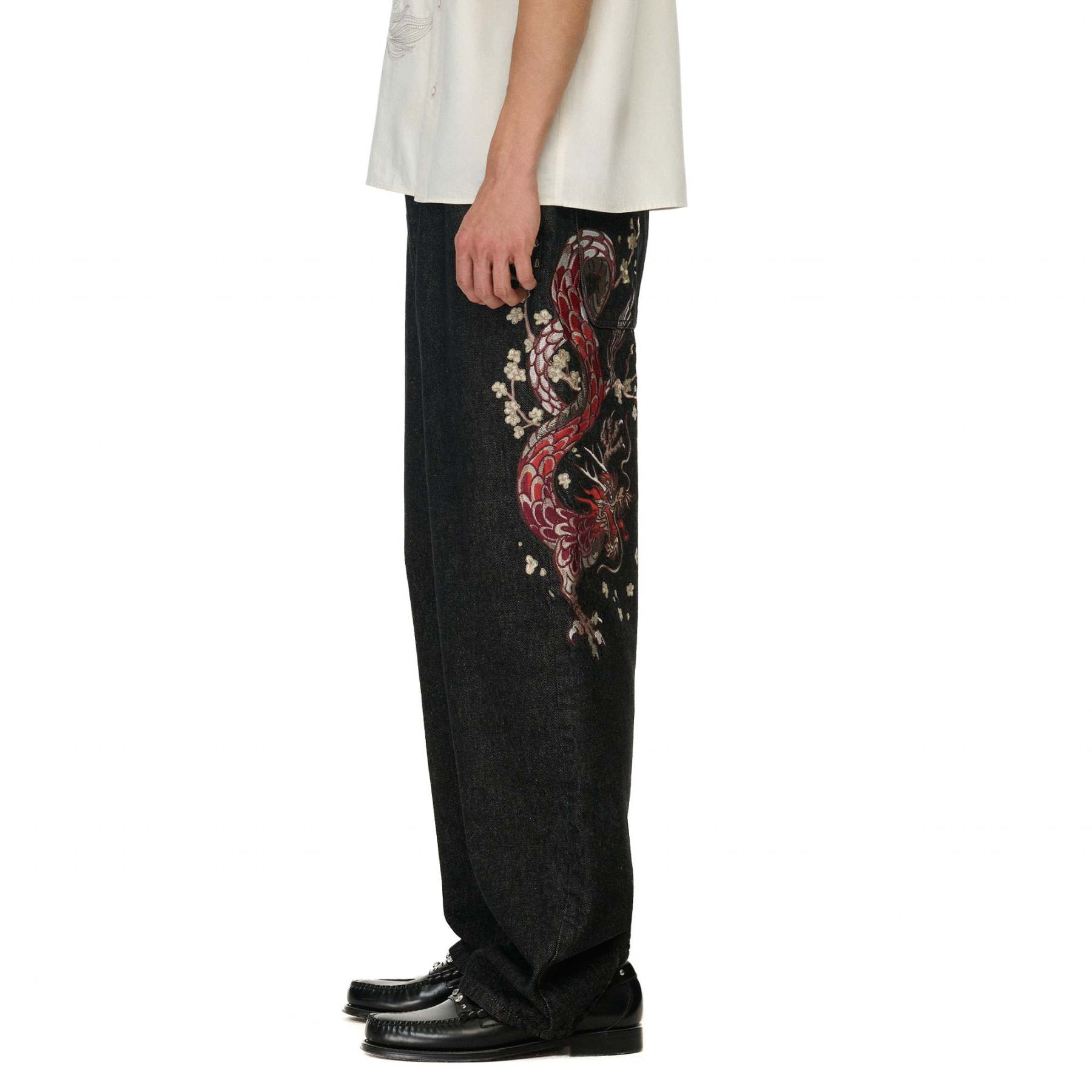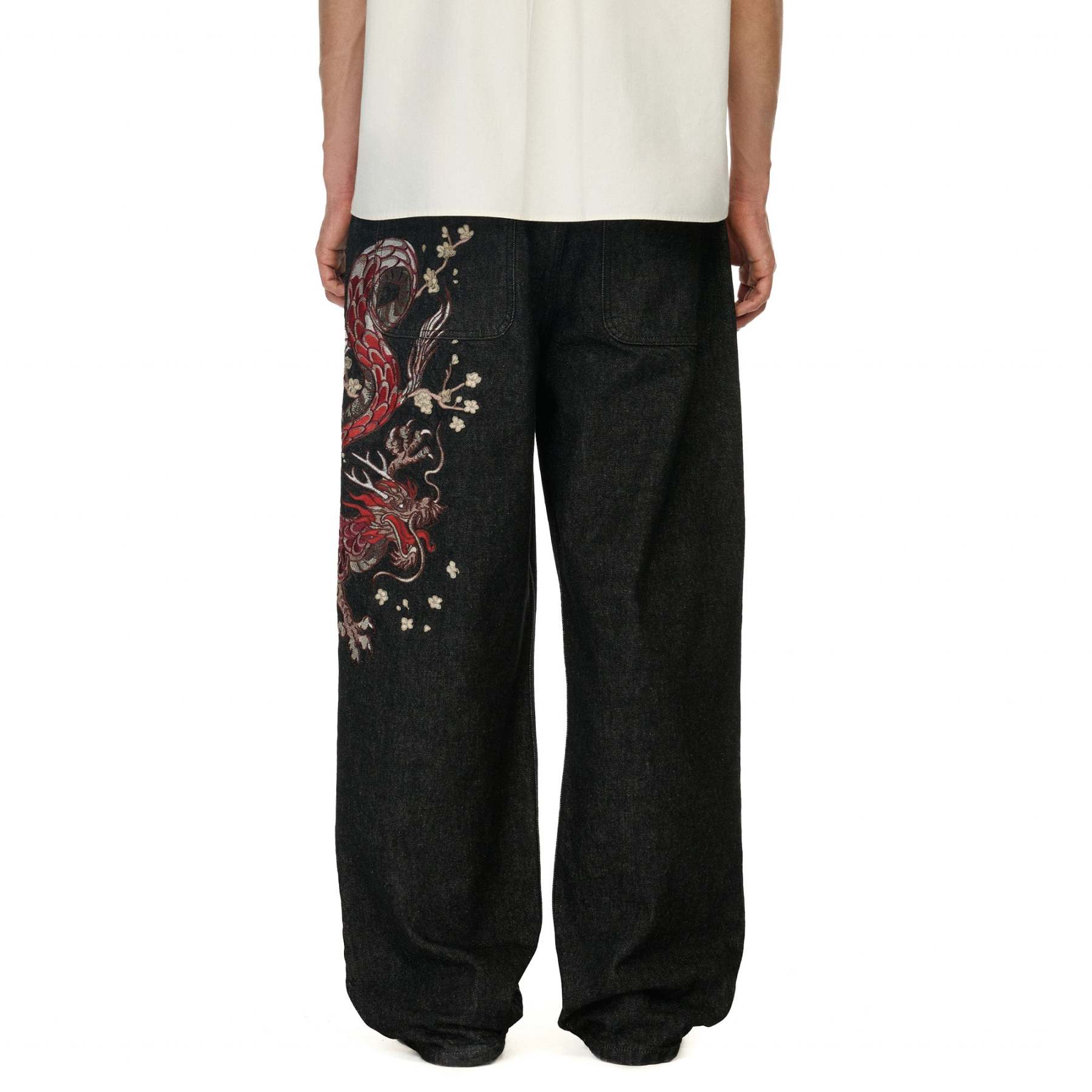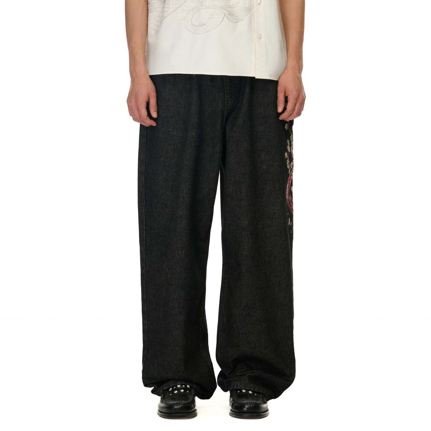 14oz raw denim / 100% cotton / embroidery on front and back / debossed printed leather patch / wash inside out / balloon fit / fits true to size